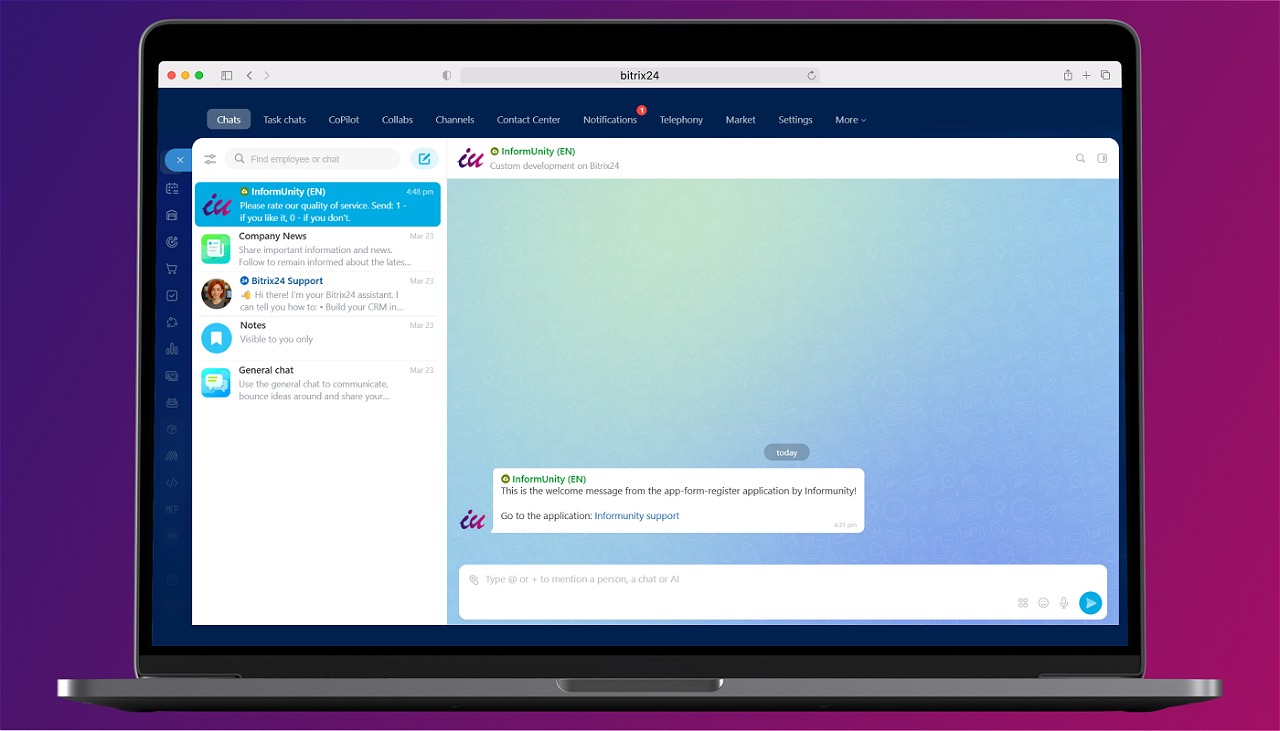 The chat right in your Bitrix24 (the link opens a chatbox in your Bitrix24).