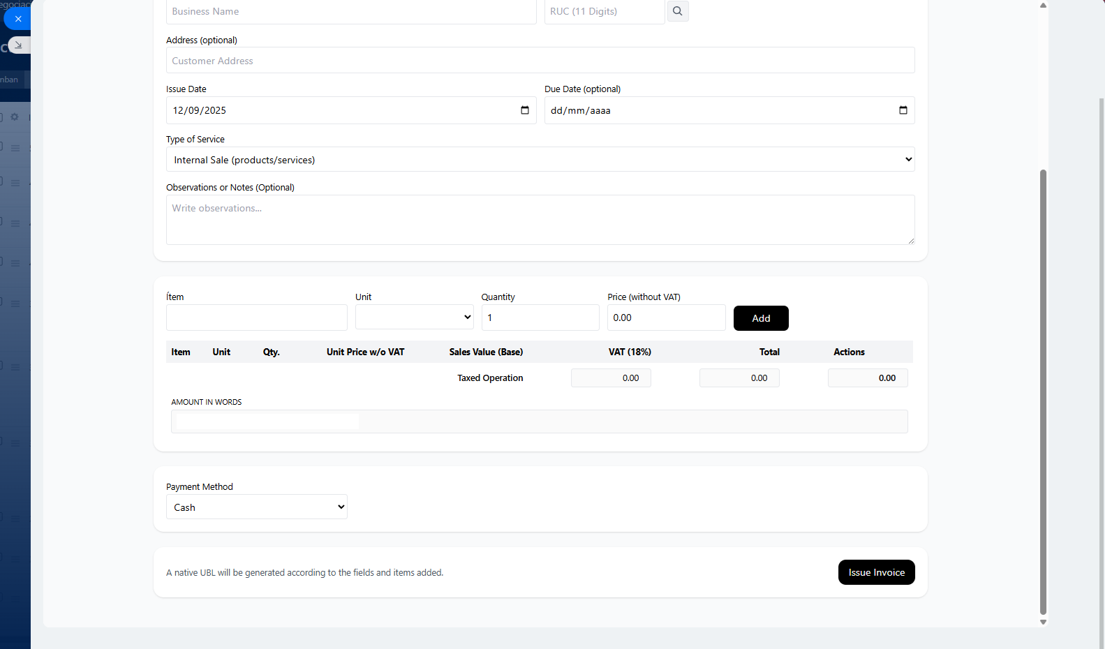 The app is directly integrated with SUNAT’s API, ensuring that every document issued complies with the current legal regulations in Peru. You will also have the option to cancel (void) previously issued invoices when required.