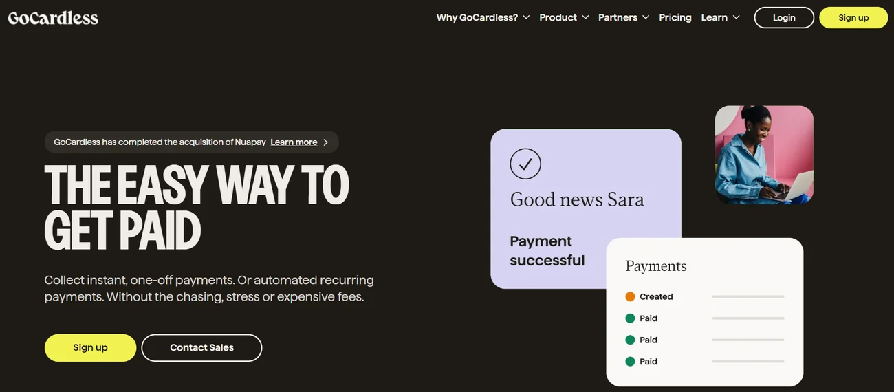 GoCardless may not operate in the same number of countries as some of the other Stripe alternatives on this list, but its focus on recurring payments makes it a top option for businesses that rely on subscriptions or installment payments. Leveraging open banking APIs, it simplifies direct debits and reduces administrative tasks by automating payment scheduling.