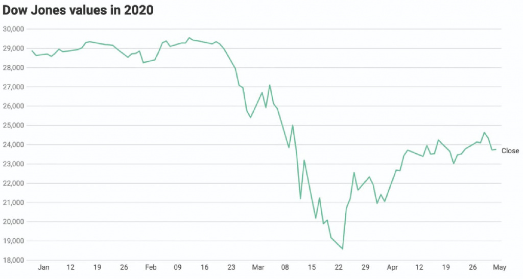 The same holds true for the US stock market, which is somewhat of an indicator of business activity and a reflection of the ongoing economic trends. As evident from the Dow Jones graph below, the lowest point seems to have been passed and now it’s on the rising trend again (other indexes like the S&P 500 and NASDAQ follow the same trend).
