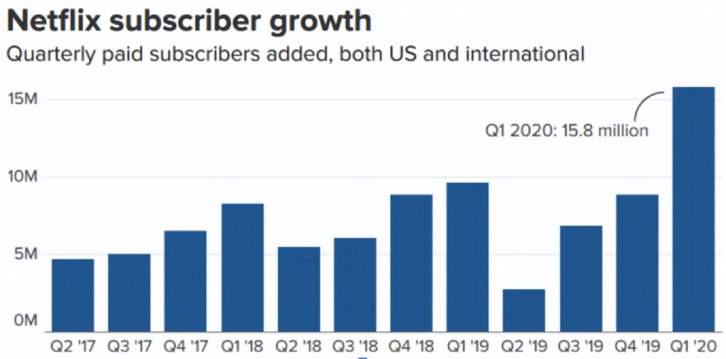 - Netflix added 15.8 million new paid subscribers in Q1 2020 - an all-time high for the company. They expect to add some 7.5 million more in the second quarter