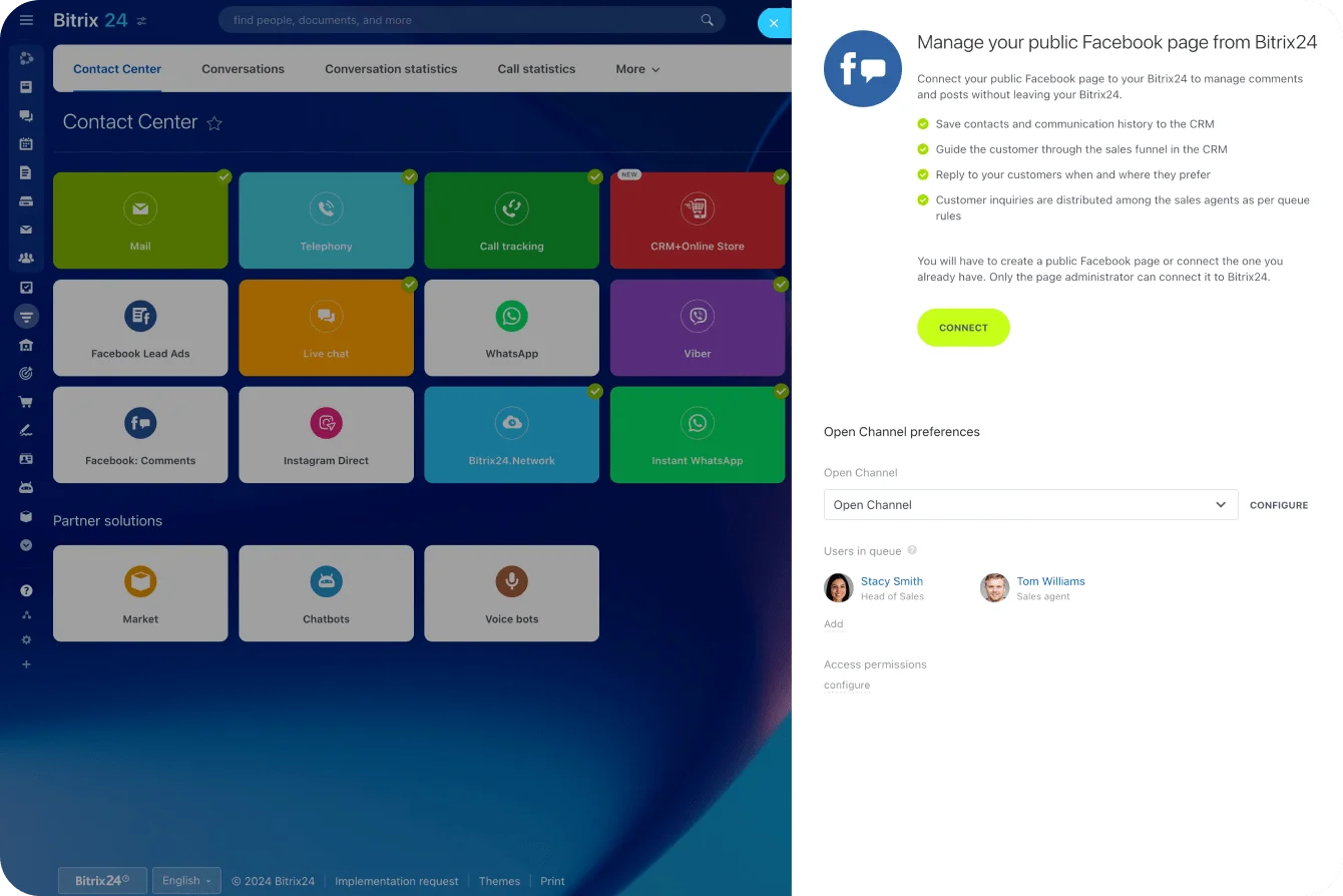 Bitrix24's Contact Center gives your team a shared workspace where every DM ties to a CRM record, every lead has a clear owner, and stages show what needs attention right now.