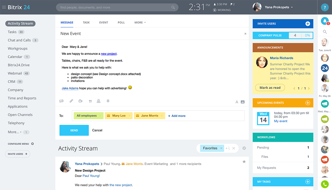 Bitrix24's Activity Stream provides users with real time updates, smart following, notification settings, and company-wide announcements. You can schedule events, attach files, receive immediate feedback from your colleagues - all done inside your personalized Activity Stream.
