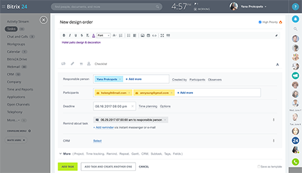 Repeating tasks and task templates help you automate regular chores and recurring work routines. Because task templates in Bitrix24 support subtasks and checklists, they are ideal for repeating business processes, such as hiring/terminating employees, onboarding new clients or starting new projects. Automatic task creation triggered by specific events is available via Bitrix24 visual business process designer.