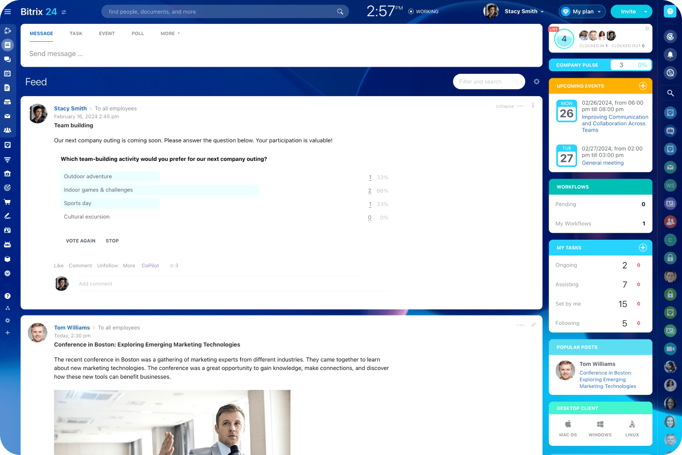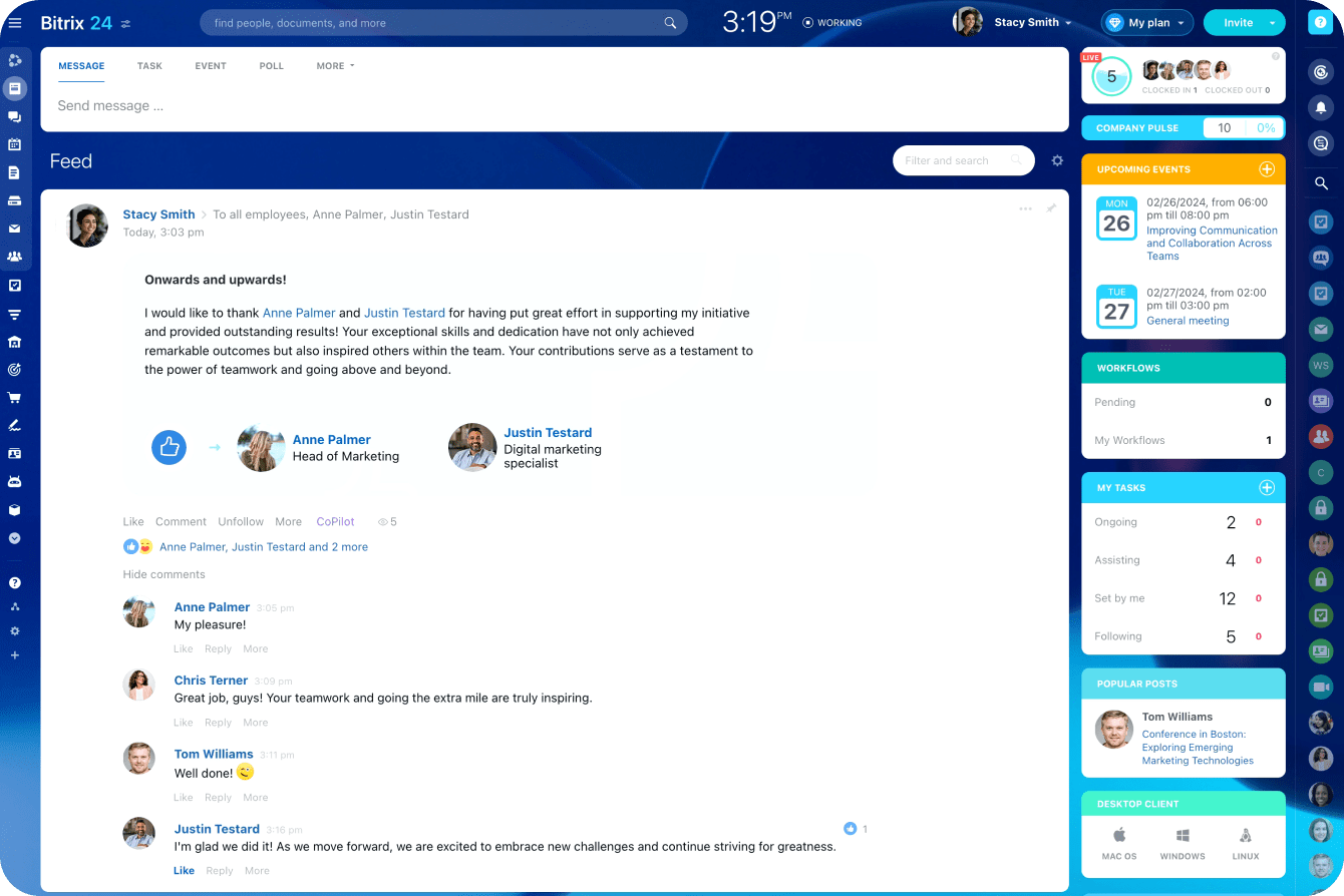 Bitrix24 membantu anda untuk menggalakkan interaksi sosial dan meningkatkan budaya syarikat dalam pasukan anda dalam cara bersifat semula jadi yang ada hubungan dengan kerja mereka.