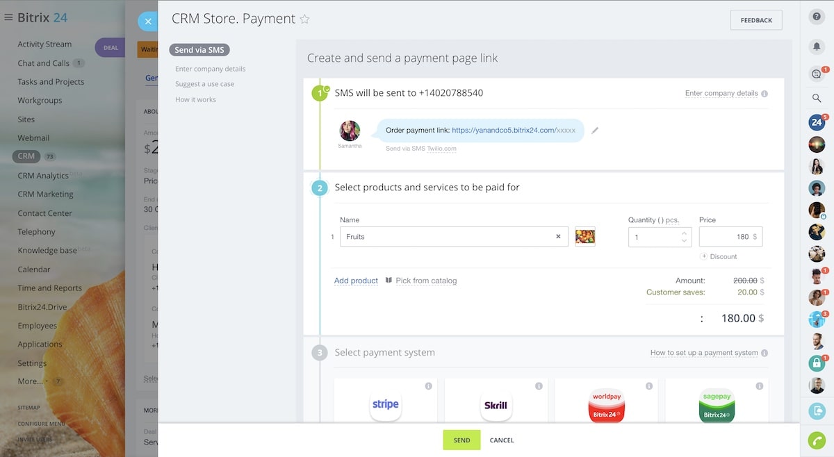 Take and process orders online. Accept payments directly in your CRM and get orders delivered to your clients. Track orders online. All within Bitrix24.