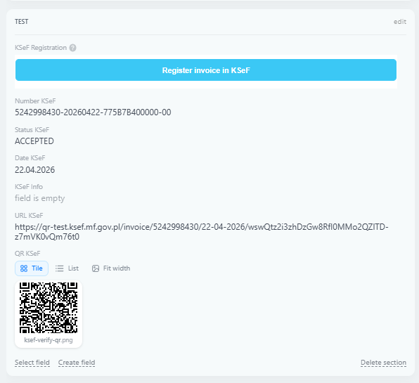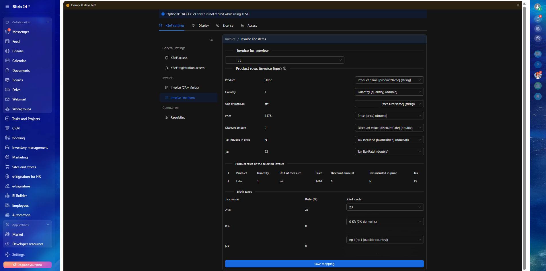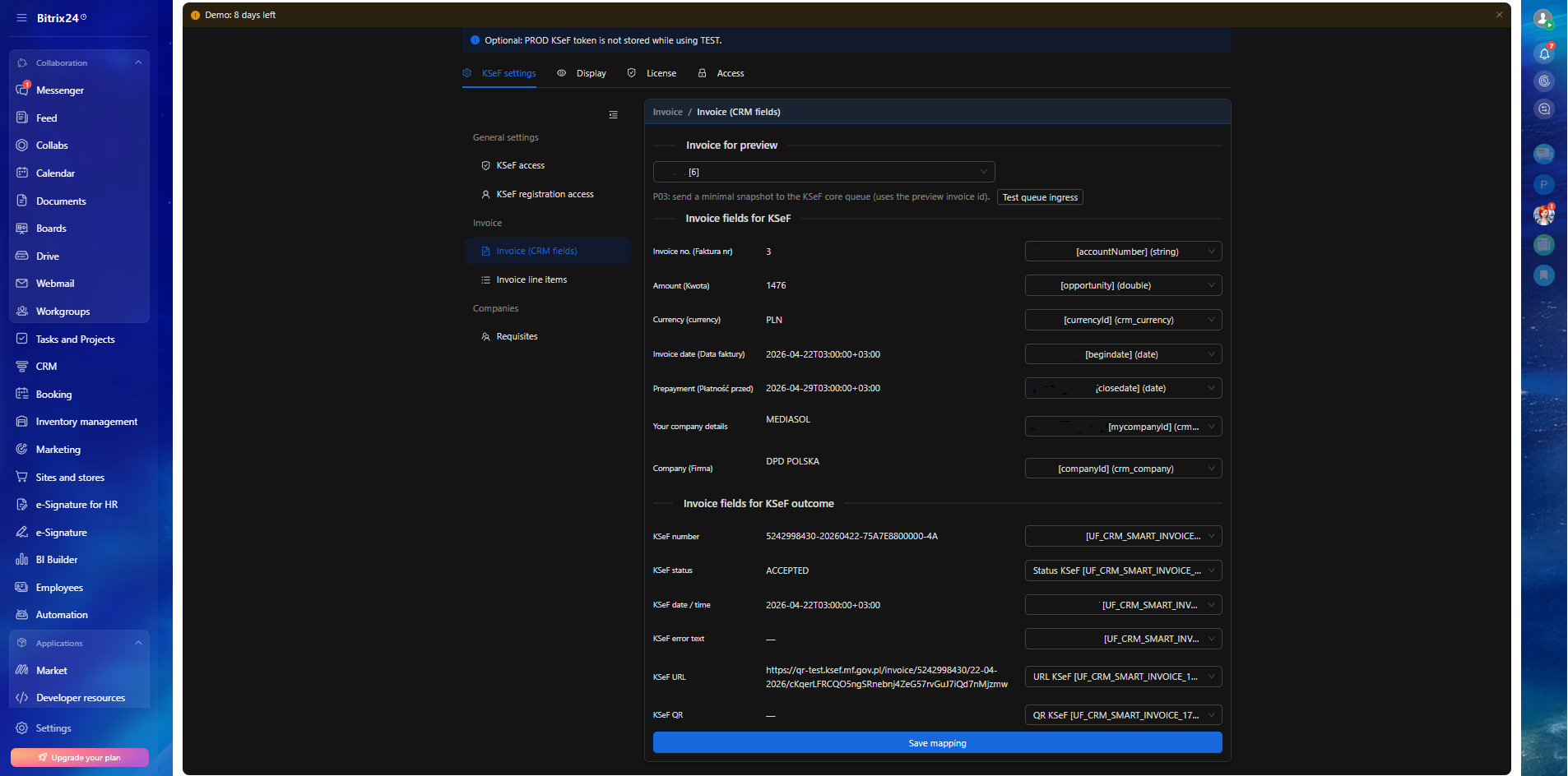 ✓ Automatic retrieval of the KSeF number and saving it in the Bitrix24 invoice details form;
