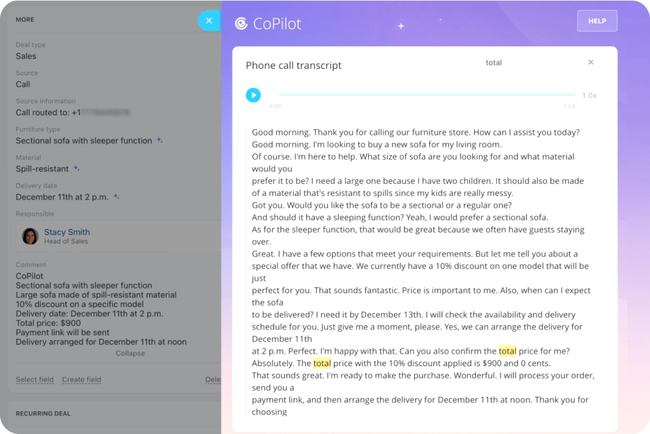 วางสายโทรศัพท์หลังจากการโทร 35 นาทีกับลูกค้าใช่หรือไม่? ไม่จำเป็นต้องย้อนกลับไปฟังทั้งหมด CoPilot ของเราจะถอดความการโทรของคุณ ให้อยู่ในรูปแบบข้อความที่ดีและอ่านง่าย