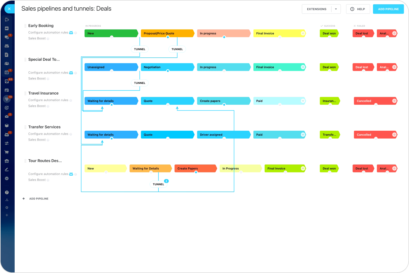 กำหนดค่ากฎและทริกเกอร์ของระบบอัตโนมัติ เพื่อทำให้วิธีที่คุณทำงานกับดีลเรียบง่าย เชื่อมต่อไปป์ไลน์การขายต่างๆ ผ่านอุโมงค์